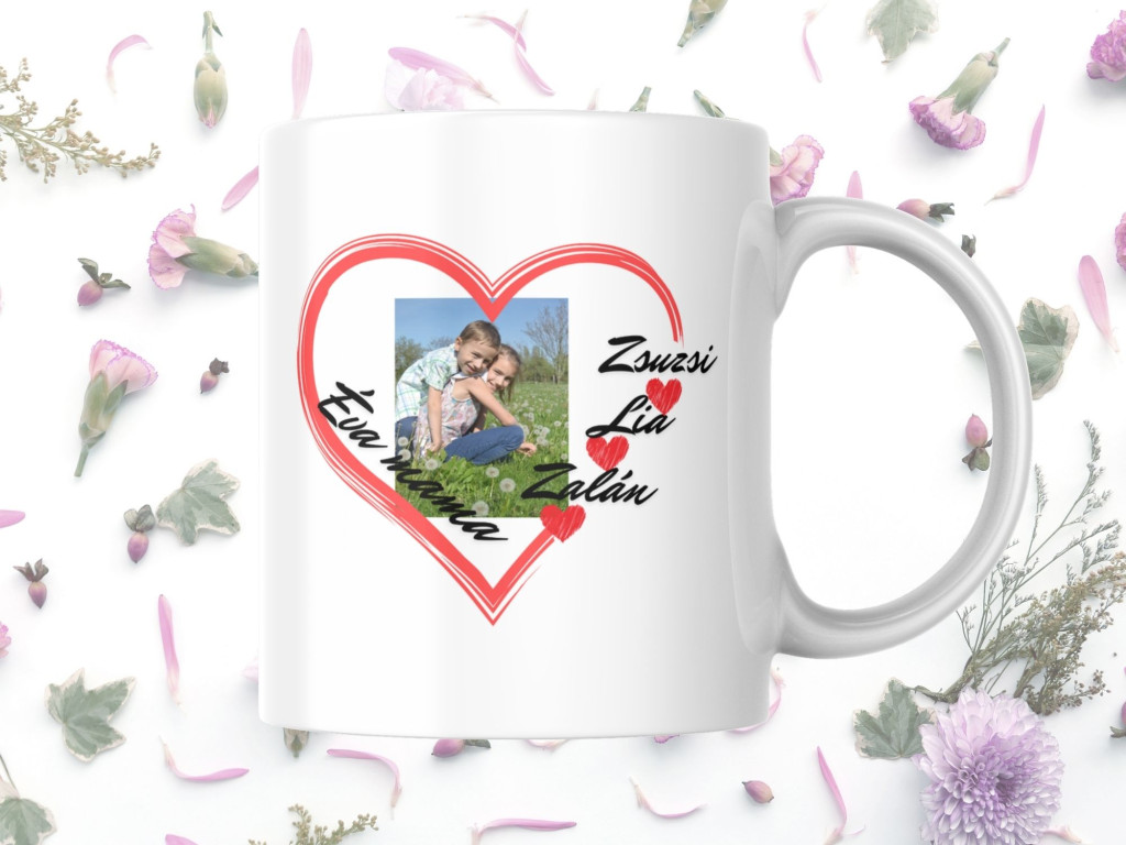 Ez a 3 dl-es kerámia bögre egy szív alakú grafikával készül, amelyben a választott fotó és a családtagok nevei szerepelnek.